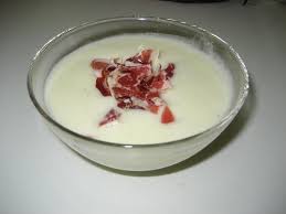 Medio melón, un yogurt griego, medio limon exprimido, un ramillete de menta fresca, 200 ml. de nata líquida, sal, pimienta blanca molida, 2 lonchas de jamon serrano.